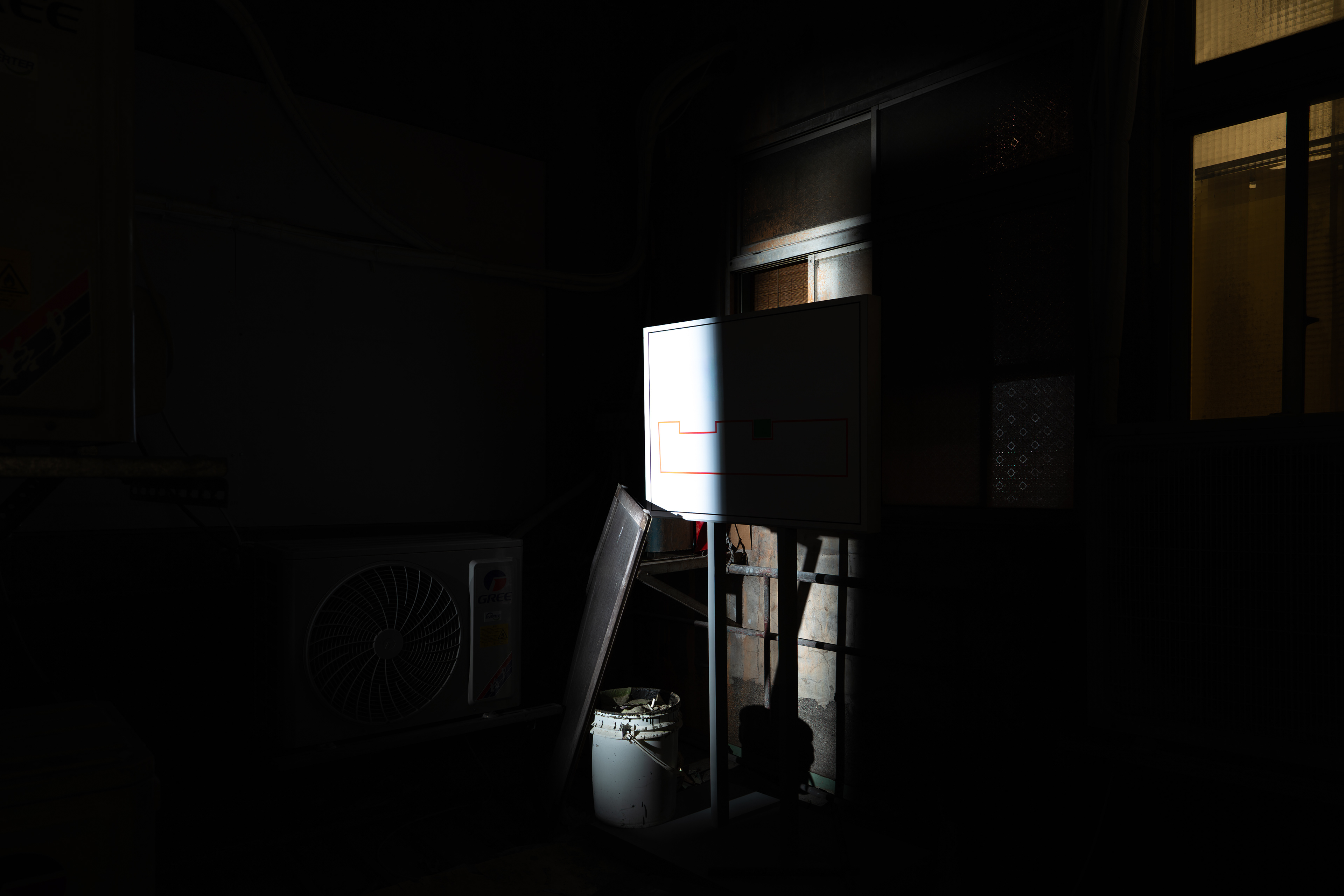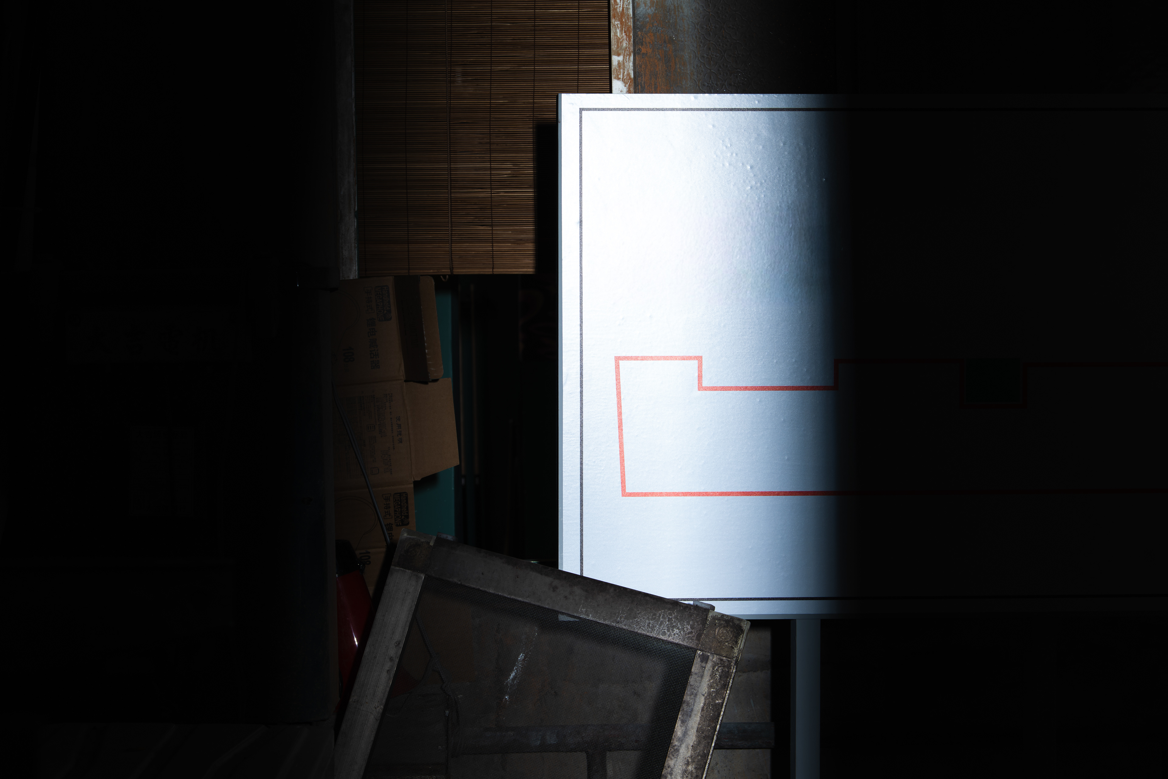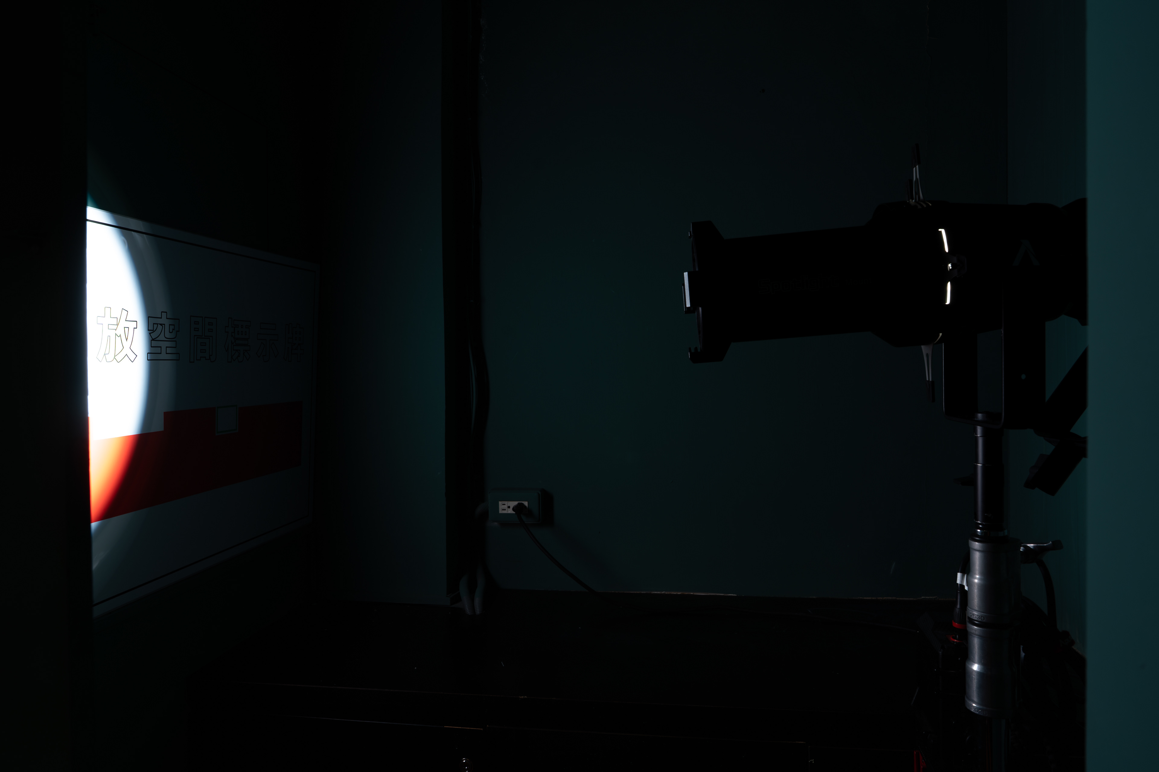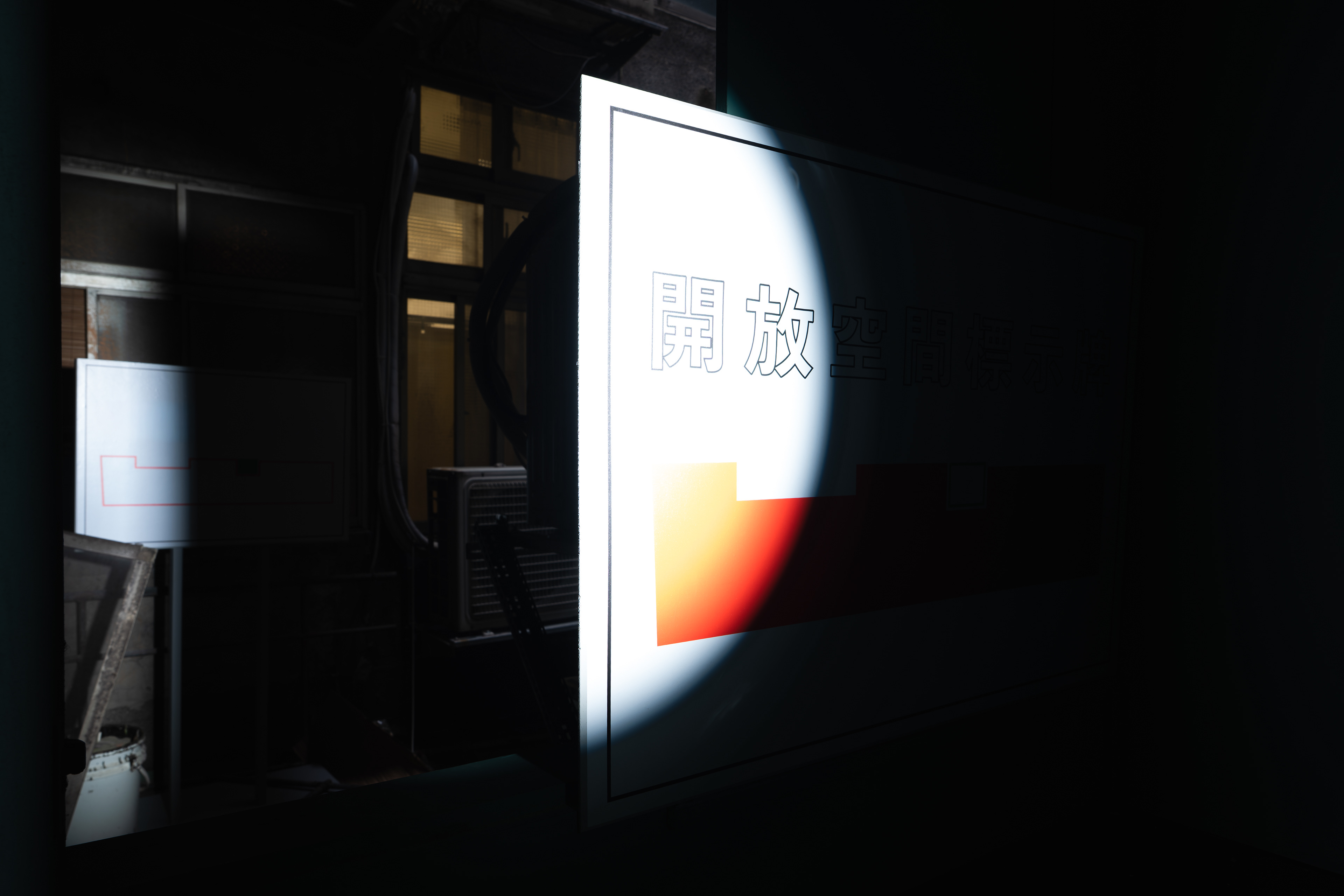 《界面:懸置、缺席、空白》,2026,聚光燈、木板、圖像輸出、告示立牌,依場域而定